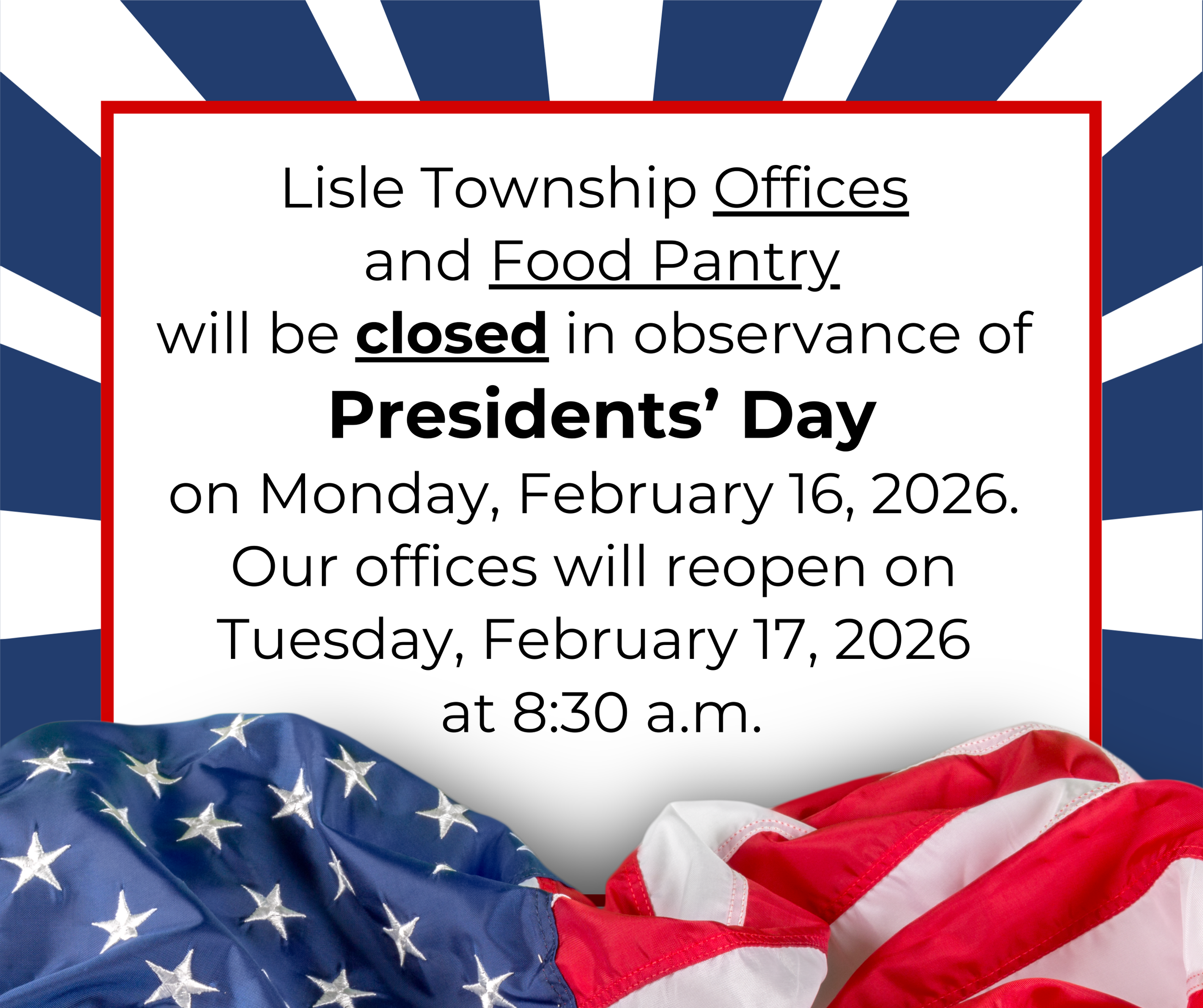 Lisle Township Offices and Food Pantry will be closed on Monday, February 16, 2026, in observance of Presidents’ Day.